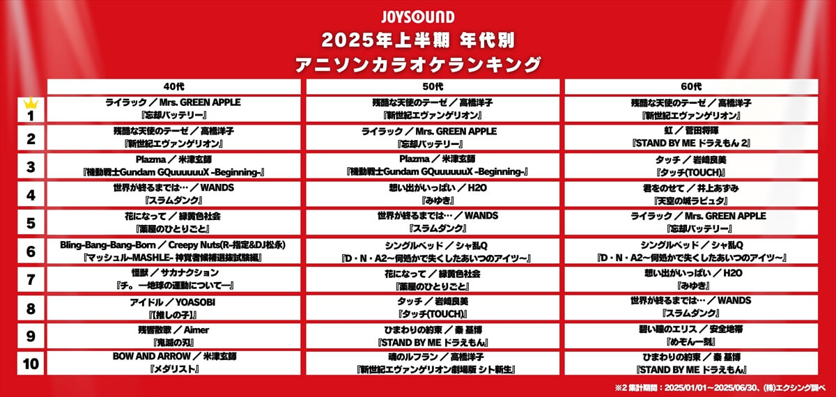 2025.07.31JOYSOUNDが、『2025年上半期年代別アニソンカラオケランキング』を発表した。