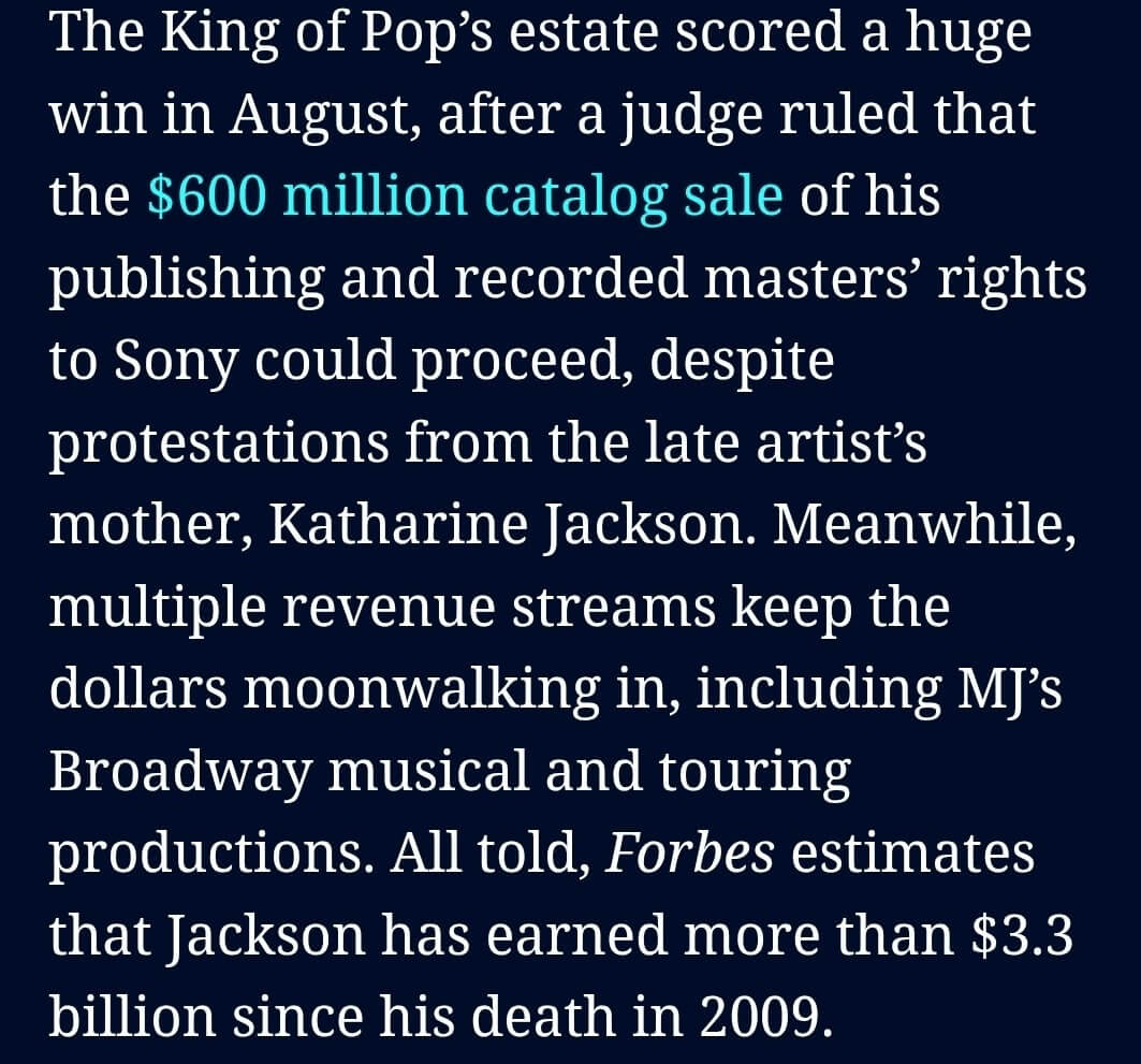 フォーブスによると、マイケル・ジャクソンのキャリア収入は2018年時点で42億ドルで、そのうち21億ドルは彼の生前に稼がれた。2024年までに彼の死後の収入は合計33億ドルに達し、総額54億ドルとなり、最も稼いだミュージシャンとなった