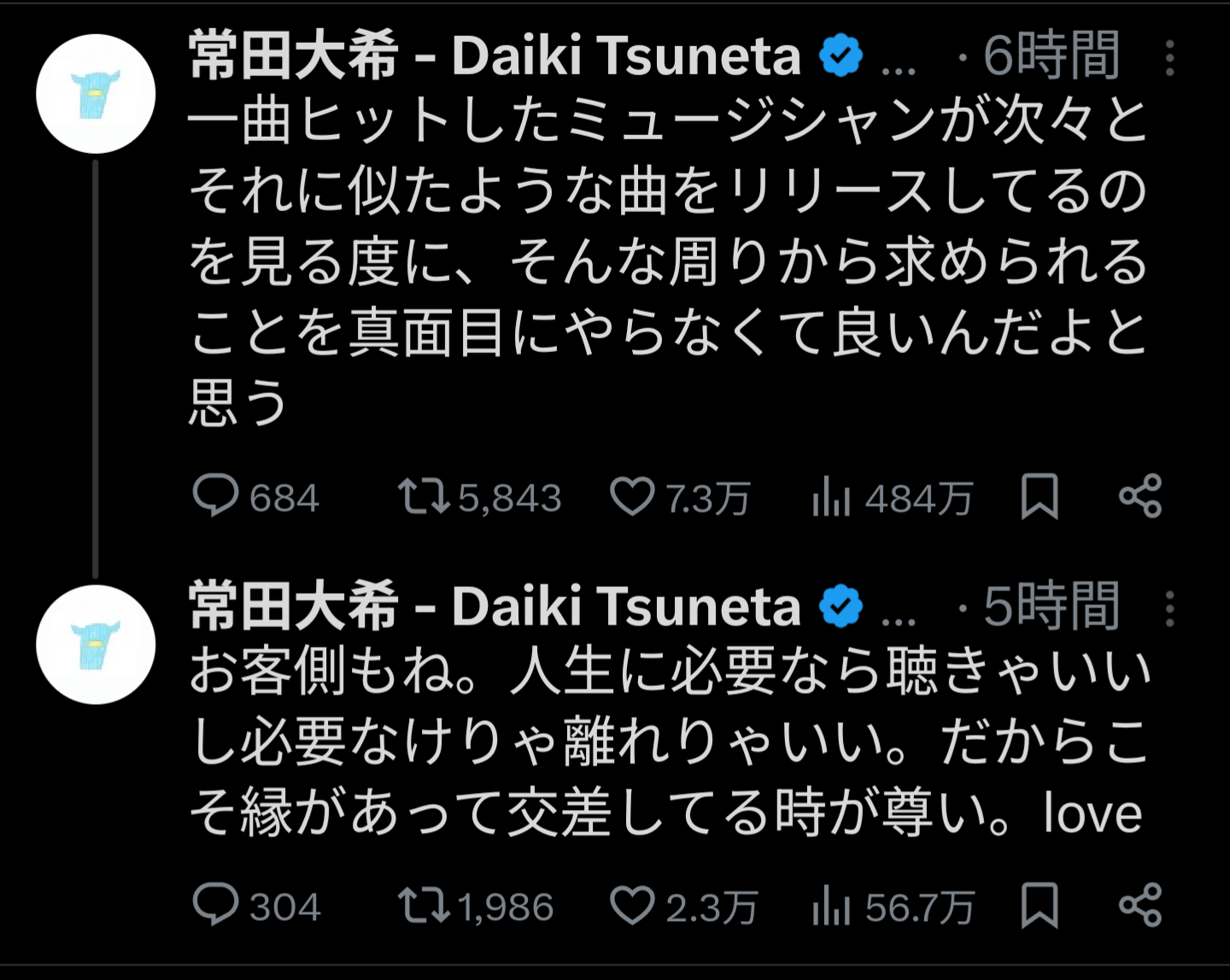 37. 常田のこういう言動は昔からだし、もう全肯定ファンのつもりで全部許容してるけど、最近常田が全然売れる曲作れてないから、負け惜しみにしか見えない感じはするのはわかるわ だから叩くやつがいるのはしょーない