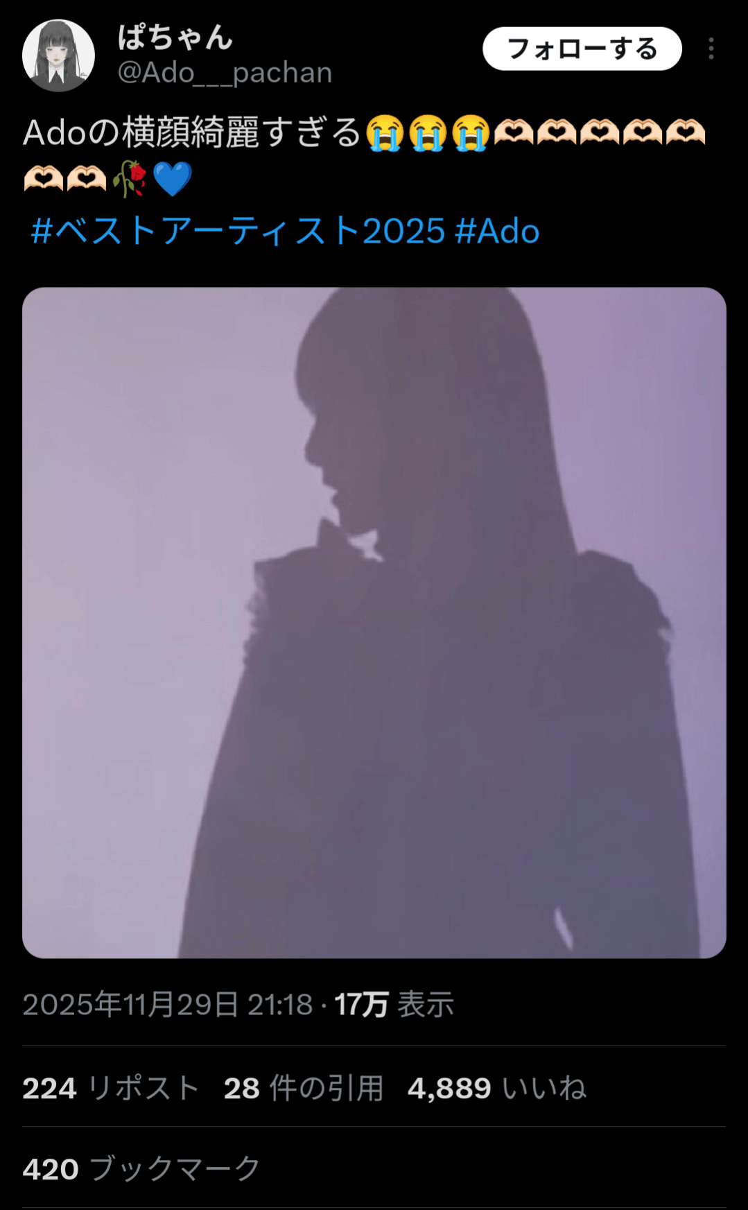 1: 2025/11/16(日) 10:16:59.82 ID:+xrZnv630さすがにライブくらい顔出してもええんちゃう?Ado YouTubeチャンネル