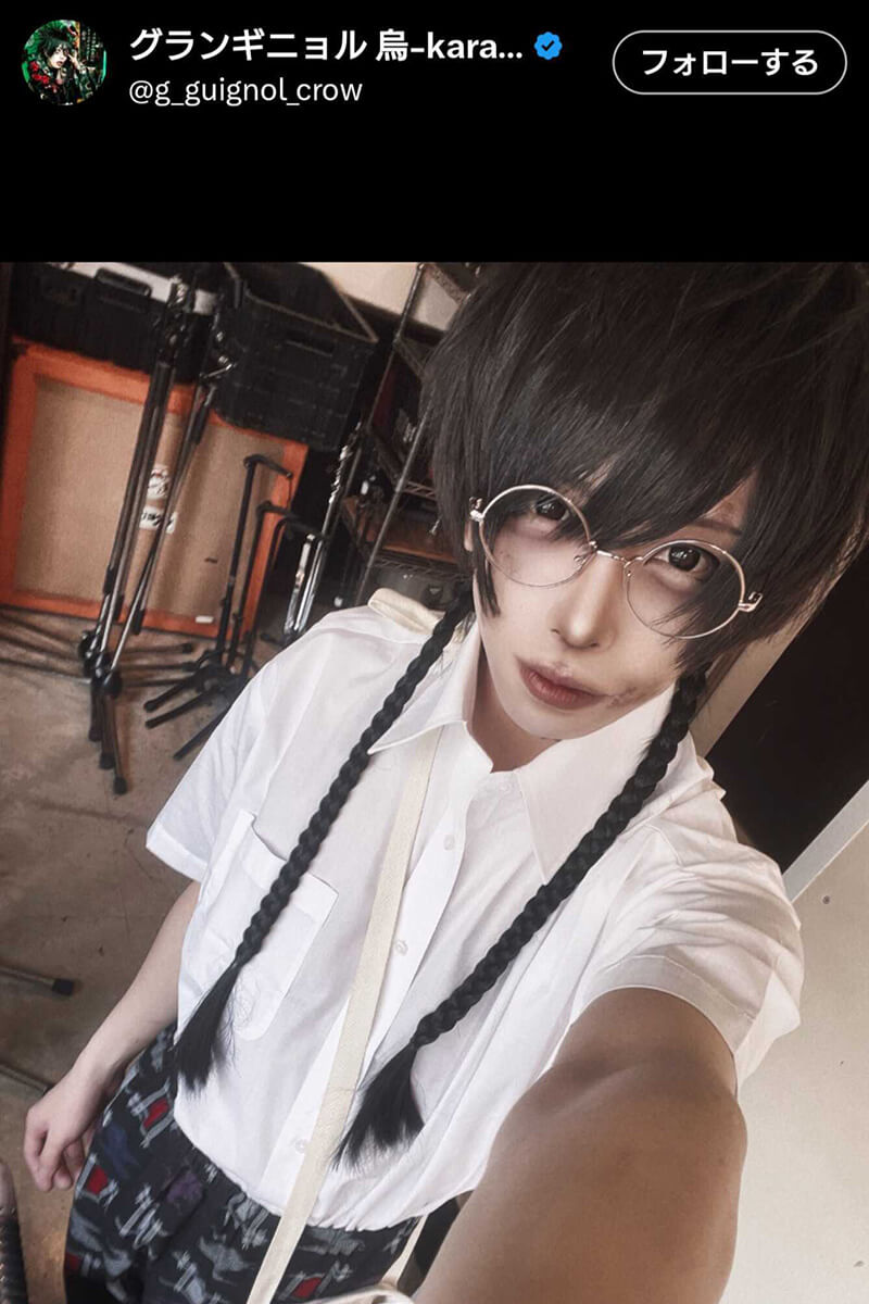 10日、ライブを終えると烏-karasu-はひめゆり学徒隊をイメージしたというライブ衣装を着用した自撮りをXで公開した。そこには泥に汚れたようなメイクを顔に施した烏-karasu-の姿が。髪は三つ編みで白いシャツを着て、下はもんぺを合わせ、救急鞄のような白いバッグも肩から掛けていた。
