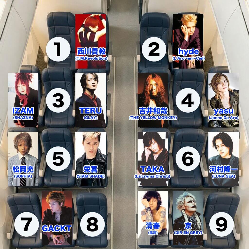 左手奥の通路側は「T.M.Revolution」の西川貴教さん、通路を挟んだ窓際はL’Arc~en~Cielのhydeさん。奥から2列目の左側窓際はSHAZNAのIZAMさん、一席空けてGLAYのTERUさん。右手通路側はTHE YELLOW MONKEYの吉井和哉さん、一席空けてJanne Da Arcのyasuさん。3列目は左側窓際にSOPHIAの松岡充さん、一席空けてSIAM SHADEの栄喜さん。右手通路側はLa’cryma ChristiのTAKAさん、一席空けてLUNA SEAの河村隆一さん。そして最前列が両隣を空けた中央にGACKTさん、右手通路側に黒夢の清春さん、中央にDIR EN GREYの京さんが配置されている。