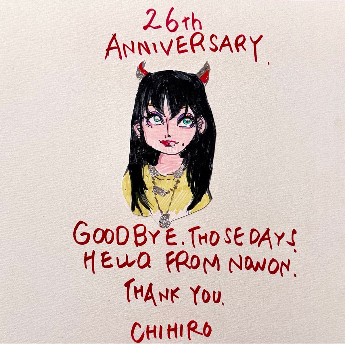 Xでは「26th Anniversary」を告知。イラストのビジュアルとともに「GOOD BYE,THOSE DAYS,HELLO,FROM NOW ON,THANK YOU」と手書きの英文でメッセージ。「CHIHIRO」としたためた。